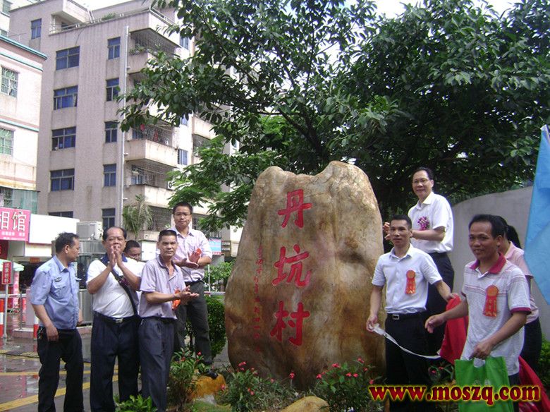 八点正,鞭炮齐响,锣鼓喧天。丹坑村中心大楼落成暨深港莫氏联谊会挂牌仪式开始了。首先由莫家拳的莫家兄弟舞狮庆贺,接着丹坑村董事长莫明春以及深港莫氏联谊会会长莫富权等人剪彩。这时一阵阵鞭炮响彻云霄,随着舞狮队舞狮人山人海十分热闹,参加庆典活动的人有上千。人们个个带着笑脸,欢庆,祝贺。接着莫明春等领导揭牌,首揭丹坑中心大楼,再揭深港莫氏联谊会牌,最后揭丹坑村牌。每揭一牌鞭炮齐鸣,人们欢呼齐跃,留影。十分隆重庄严,喜庆气氛。揭牌结束,莫明春又带领贵宾参观了大楼的各个办公室设备和布局。中心大楼设有老人活动中心,社区委员会,莫氏联谊会,股份合作公司,图书室,青少年活动中心等。大家看后一致赞叹不己:这是我们莫氏光荣,也是莫氏的创举,是前所未有的。